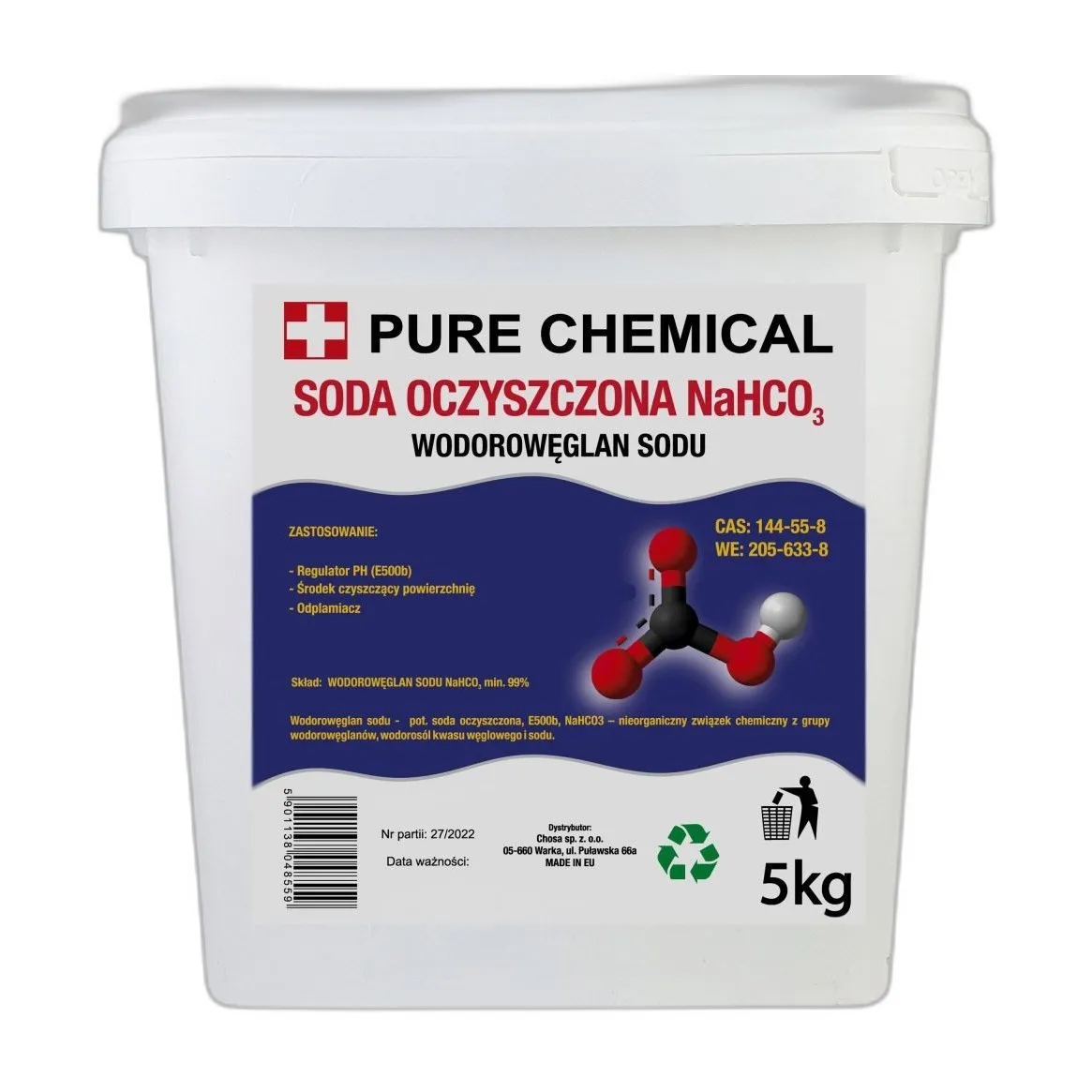 Pakiet zawiera 5 kg sody oczyszczonej i 1 kg kwasu cytrynowego. Całkowita masa: 6 kg. Przechowywać w suchym, chłodnym miejscu, w szczelnie zamkniętych opakowaniach, z dala od źródeł wilgoci i kwasów. Termin ważności: 36 miesięcy od daty produkcji, przy zachowaniu warunków przechowywania.